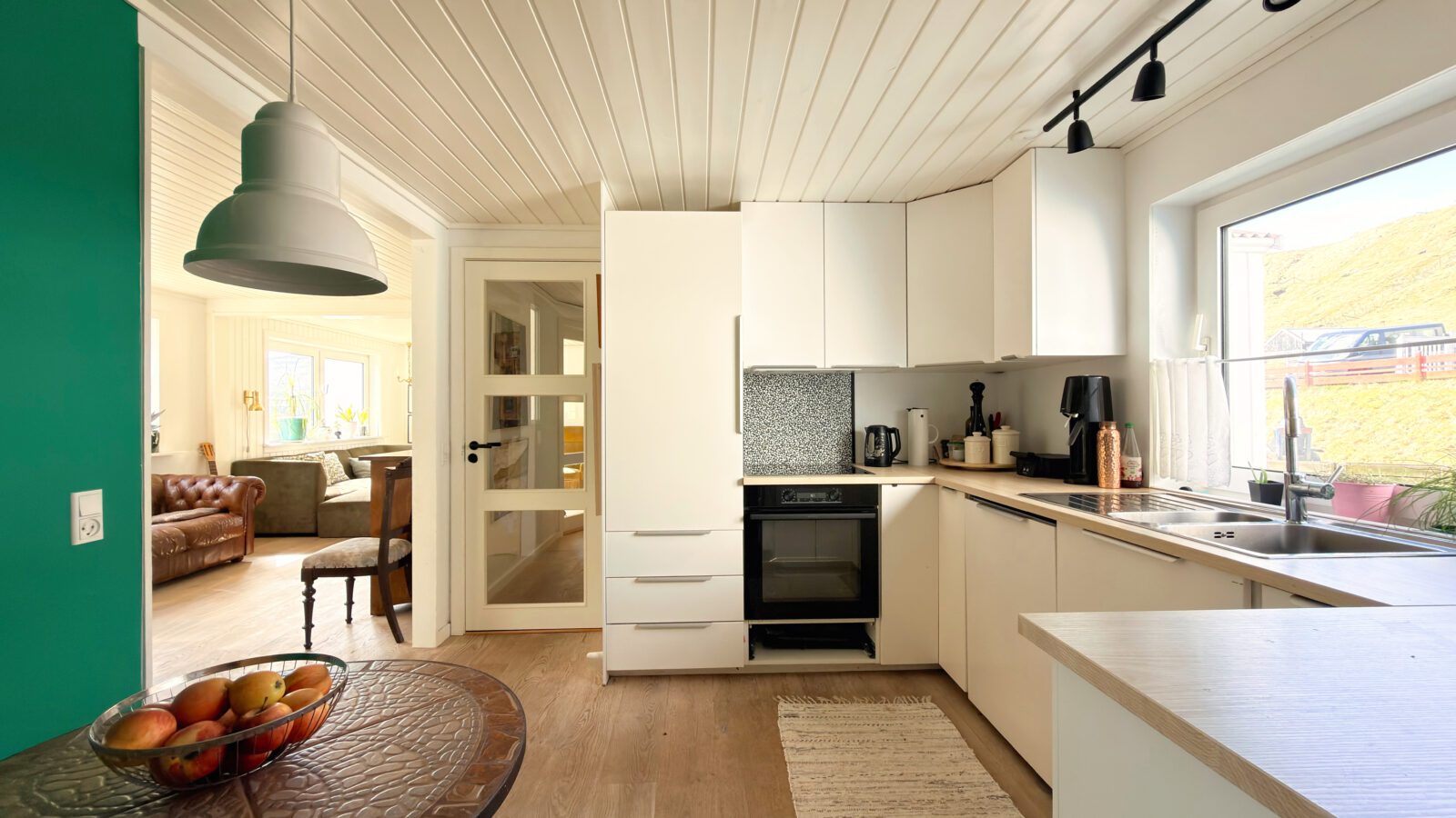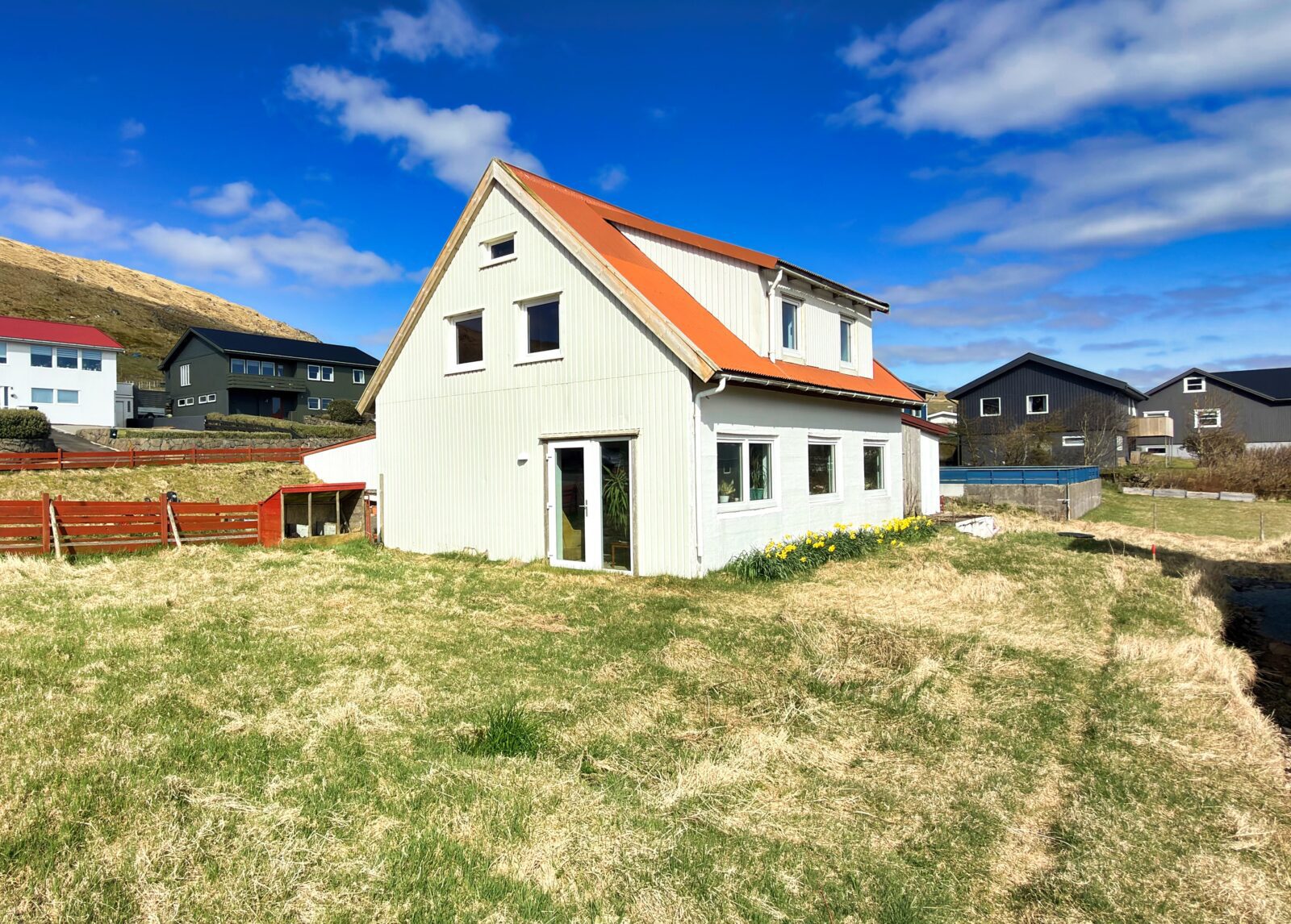 Hugnalig sethús við tveimum búeindum, sum standa væl fyri við blindan veg í Vesturbýnum, tætt við skúlar, stovnar, handlar og sparkivøll. Stórt og gott stykki er kring ognina við grasfløtu og góðum parkeringsøki við bilskýli. Húsið hevur grøna orkuskipan og góðan sólargang.