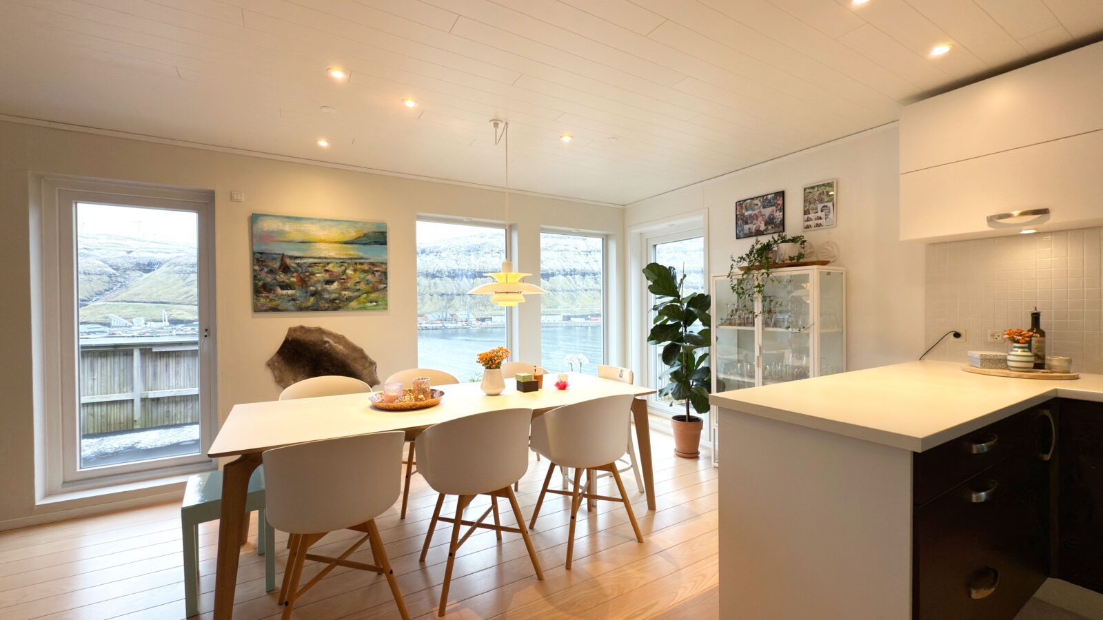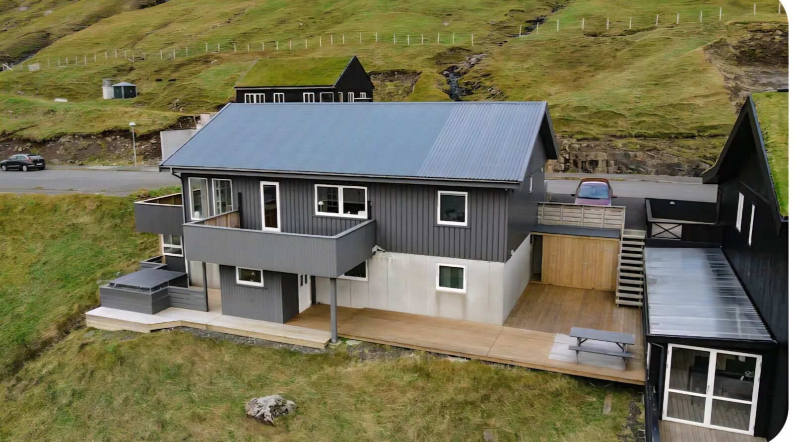 Sera snøgg sethús í trimum hæddum, sum standa væl fyri við fríum útsýni og í friðarligum og barnavinaligum umhvørvi við blindan veg og beint við dagstovn. Stórt útigólv er runt húsini við útistovu og hitapotti. Góð íbúð er í niðastu hæddini.