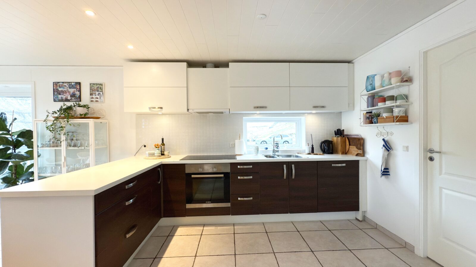 Í miðhæddini er durur, vesi, gongd, 3 kømur, baðirúm, køkur / stova og bryggers. Á loftinum er kamar og stova. Í niðastu hædd er fýrrúm og útistova umframt íbúð við duri, stovu / køki, 2 kømurum, klædnarúmi og baðirúmi. Harumframt er hjallur og skúrur.